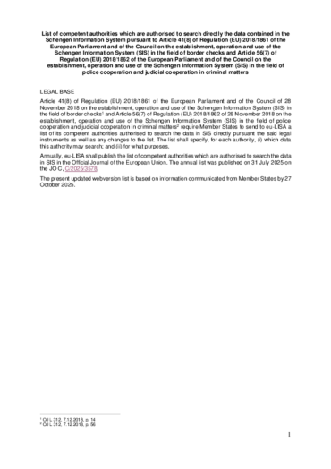 Each year, since it assumed the operational management of the system, eu-LISA publishes the list of competent authorities which are authorised to directly search the data contained in SIS as well as the list of National SIS Offices and SIRENE Bureaux. The present consolidated list is based on information communicated by Member States by 27 October 2025. The Schengen Information System (SIS) is a large-scale IT system that supports public security, border control and law enforcement cooperation in Europe and is managed by eu-LISA since May 2013.