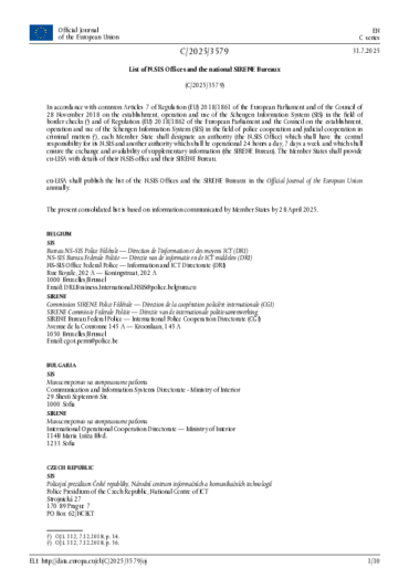 Each year, since it assumed the operational management of SIS, eu-LISA publishes the list of competent authorities which are authorised to directly search the data contained in SIS as well as the list of National SIS Offices and SIRENE Bureaux. The present consolidated list is based on information communicated by Member States by 28 April 2025. The Schengen Information System (SIS) is a large-scale IT system that supports public security, border control and law enforcement cooperation in Europe and is managed by eu-LISA since May 2013.